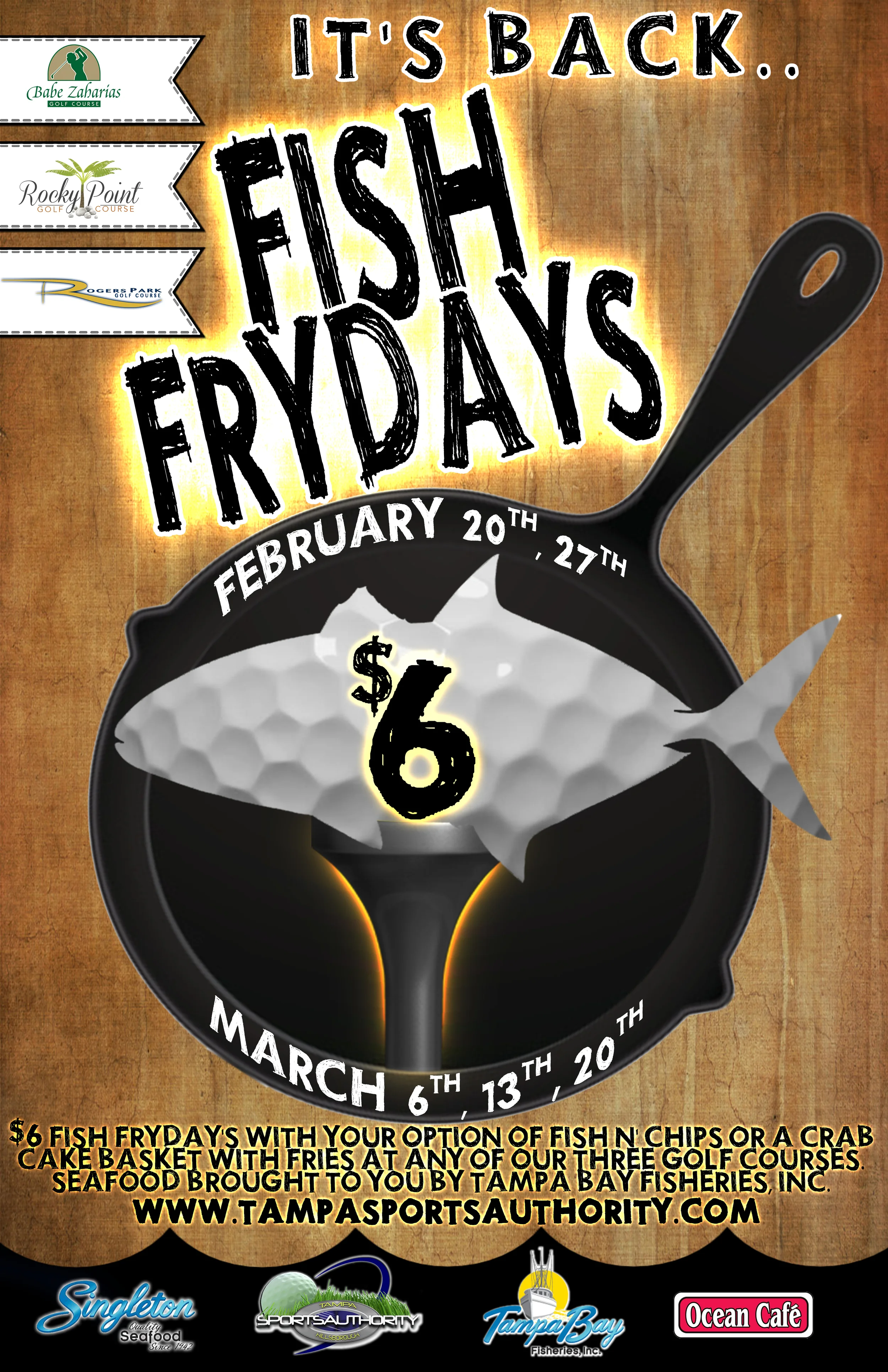 $6 FISH FRYDAY'S WITH YOUR OPTION OF FISH N' CHIPS OR A CRAB CAKE BASKET WITH FRIES AT ANY OF OUR THREE GOLF COURSES. SEAFOOD BROUGHT TO YOU BY TAMPA BAY FISHERIES, INC.